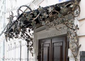 Оформление козырька в Москве художественной ковкой "виноградная лоза" в "дорогом варианте".
