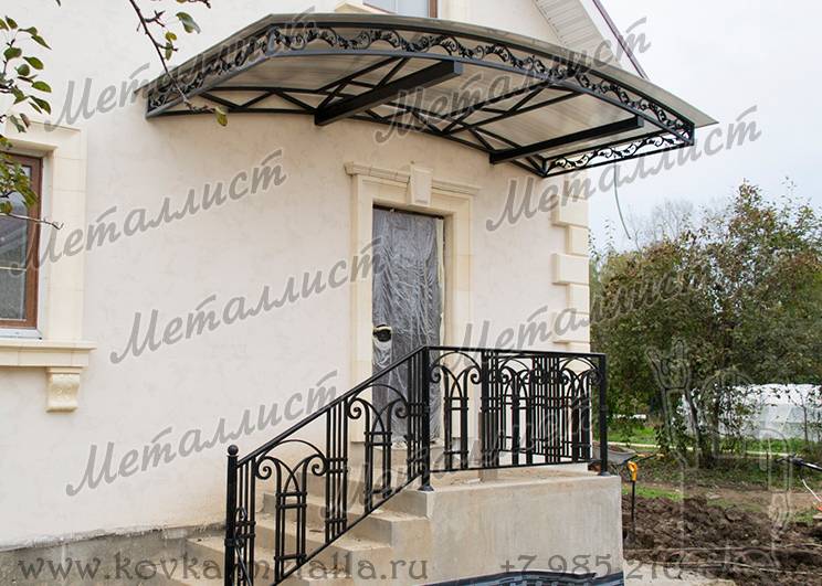 Каркас- проф.труба 40х20 (50х25, 60х30, 60х60). Рисунок- кв.12, Ф12 (кв.14, кв.16). Ручная ковка. Покрытие- сотовый поликарбонат 8мм.(10мм, 12мм, 14мм.) прозрачный или цветной.