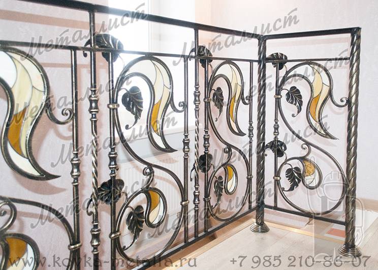 Указана стоимость изготовления 1 п.м. прямого участка перил С ЦВЕТНЫМ СТЕКЛОМ (например: балкон или ограждения террасы). В зависимости от сложности рисунка перил, наклонные участки (ограждения лестницы) могут иметь ту же стоимость или стоить на 5-10% дороже. Стоимость радиусных и радиусно-наклонных (винтовых) участков и переходов может быть определена только мастером на месте, и напрямую зависит от сложности радиуса (винта) в привязке к конкретному выбранному Вами эскизу перил. При использовании ВИТРАЖА, сложность и цветовое решение витража (после индивидуальной проработки) будет влиять на стоимость перил.