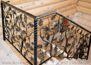 В оформлении перил может применяться кованая лоза, вьюн, хмель, дуб, береза и т.д., сетка из полосы с декоративной заклепкой.