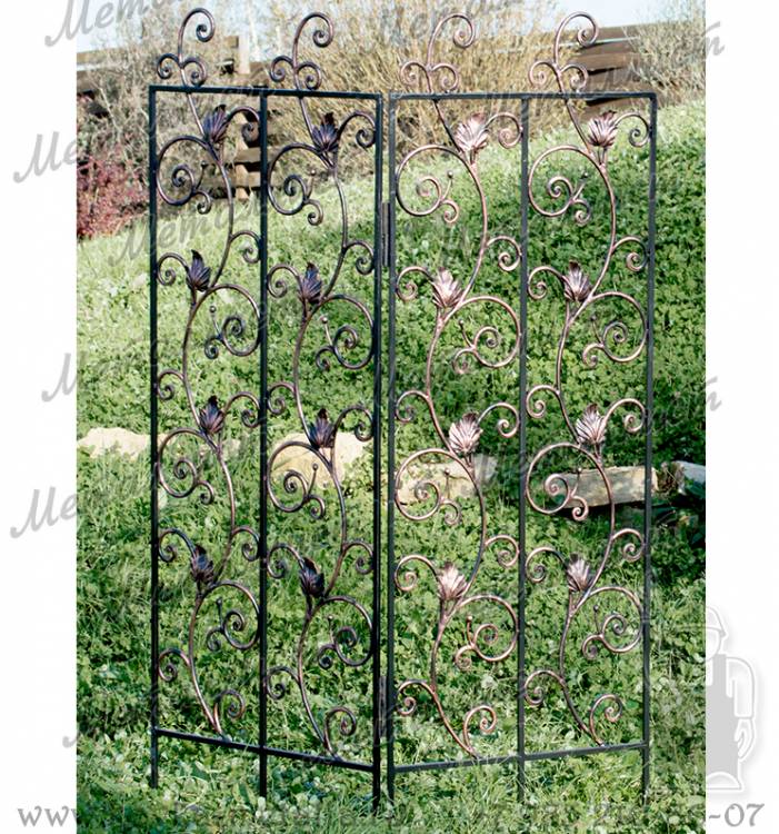 кв.12, Ф6, Ф10. 2-х секционная на петлях. Габариты: ~1800х1200 мм. Штыри в землю Ф12, L=700 мм. Ручная ковка.